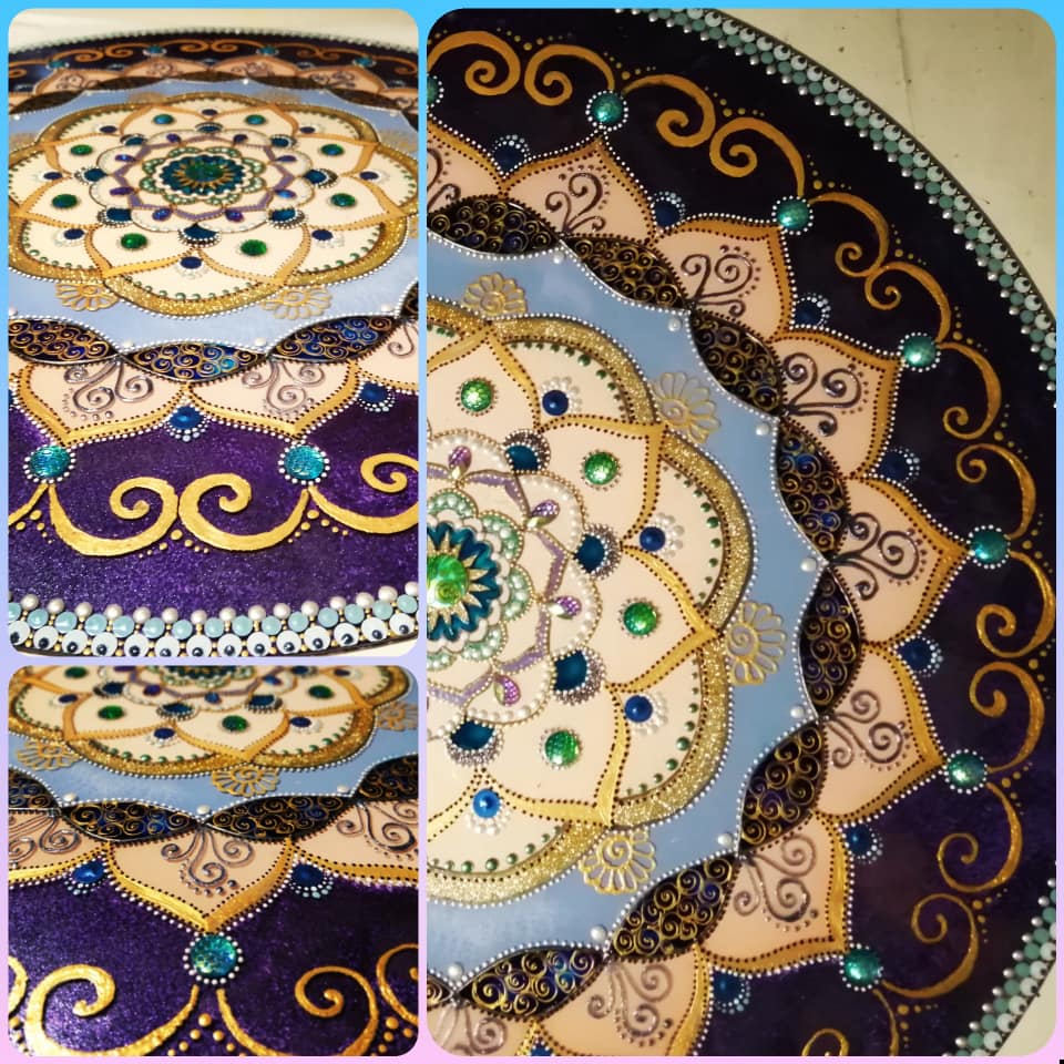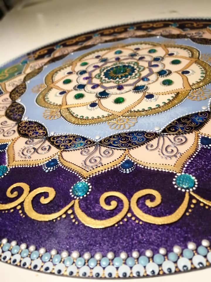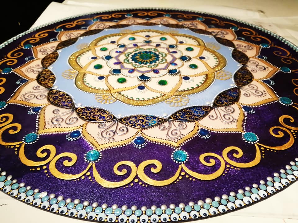 50 cm átmérőjű óriásmandala, tele kristályokkal és pontokkal.