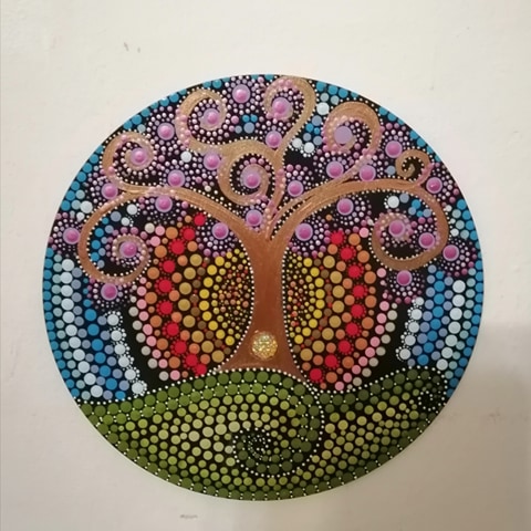20 cm átmérőjű kör alapra készült ez az egyedi saját tervezésű pontfestett Életfa. 3 mm vastag rétegelt nyírfa lemezre festettem.