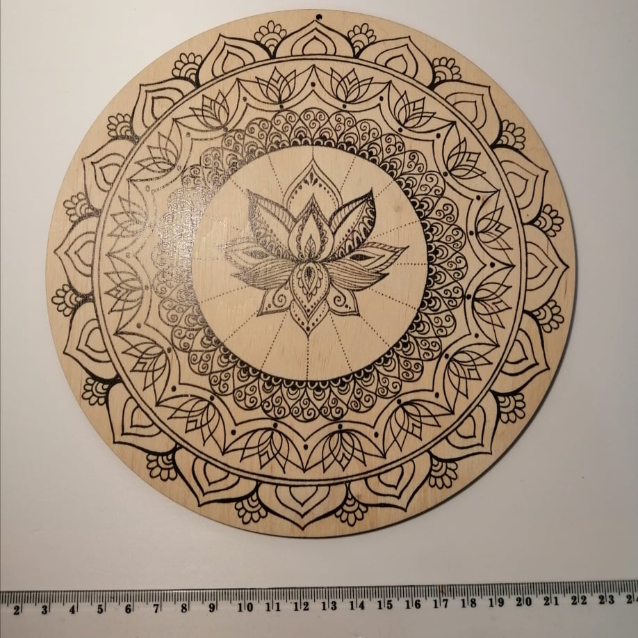3 mm vastag rétegelt nyírfa lemezre nyomtatott mandala, mely színezhető, pontozható, vagy akár natúran is gyönyörű dísze lehet lakásodnak.